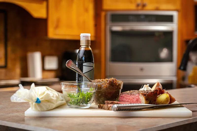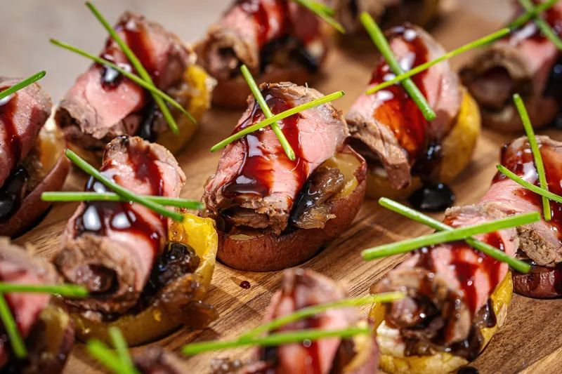 To assemble the bites, place browned potato skins on a serving platter. A deviled egg platter works great. Pipe whipped Boursin into each potato skin and top with caramelized onion. Place steak on top of onions and top with a drizzle of balsamic reduction. Finish with fresh chive on top of each bite. Great served warm or even room temperature.