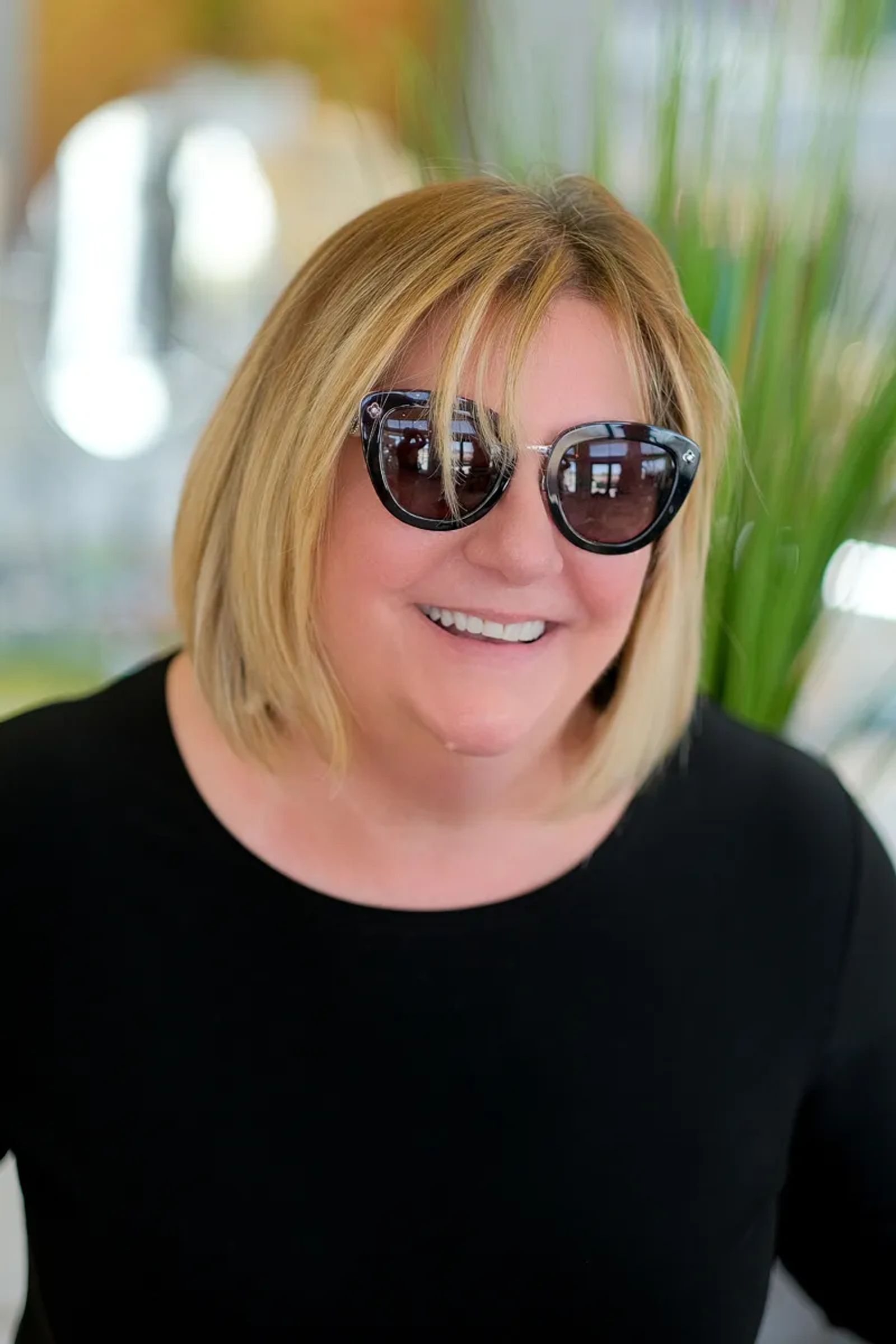 A square and slightly winged frame is the perfect balance of timeless and edgy for Linda Brooks, owner of Something Chic. With an oval-shaped face, it’s easy for Linda to look stylish in just about any shape. She’s also a fan of a good aviator frame, which is a true classic. Something Chic recently added a new brand with a mission Linda loves. Topfoxx is a company that’s 100 percent women-owned and operated. With every sunglass purchase, the company donates a pair of reading or distance glasses to the visually impaired around the world.