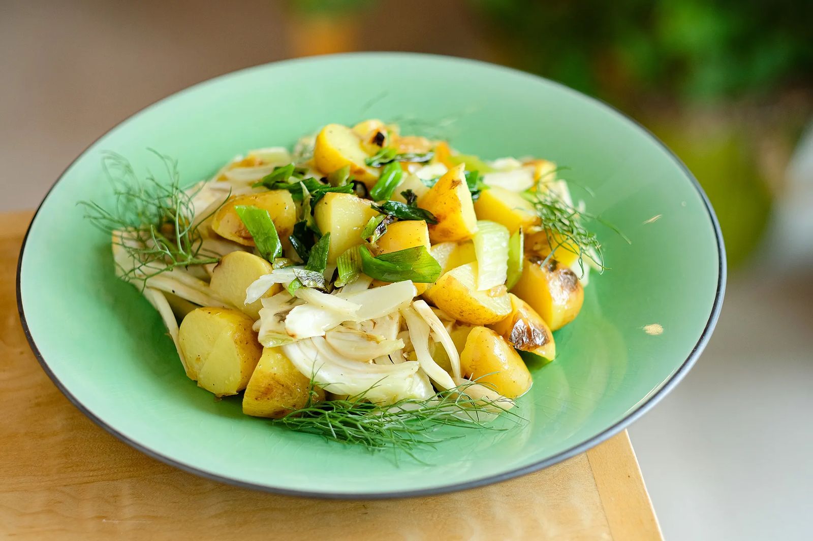 Preheat grill to medium-high. Lightly oil grate. For the dressing, whisk together oil, vinegar, mustard, garlic, sugar, and salt and pepper to taste. Set aside. Bring a pot of water to a boil, add salt and potatoes. Cook for 15 minutes or until potatoes are tender. Strain potatoes from water with a slotted spoon. Bring water back to a boil and blanch fennel for about 2 minutes. Remove fennel from water. Toss potatoes, fennel and green onions with oil and salt. Grill potatoes, fennel, green onions and celery until grill marks form, about 2 to 3 minutes on each side. Cut potatoes in quarters. Cut off root bottom of fennel and discard, and then coarsely chop. Cut onions into ½ inch slices. In a bowl toss together potatoes, fennel, green onions, and some fronds with dressing. Garnish with fronds.
