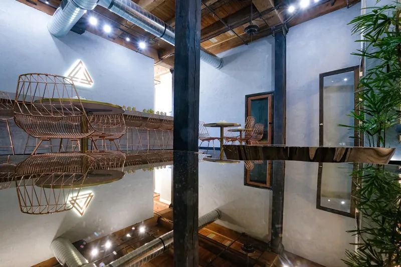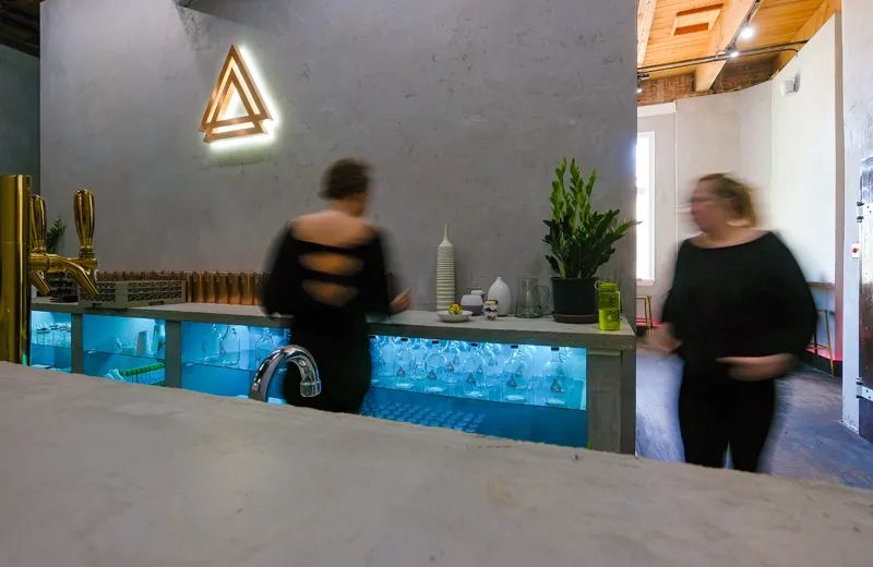 The look and feel of this downtown sanctuary has an urban vibe with minimalistic features. The 20-foot concrete kombucha bar with its 15 golden taps draws your attention. Tremendously high ceilings emphasize the soft lighting. A large sectional with white comfy cushions draws you into its comfort.