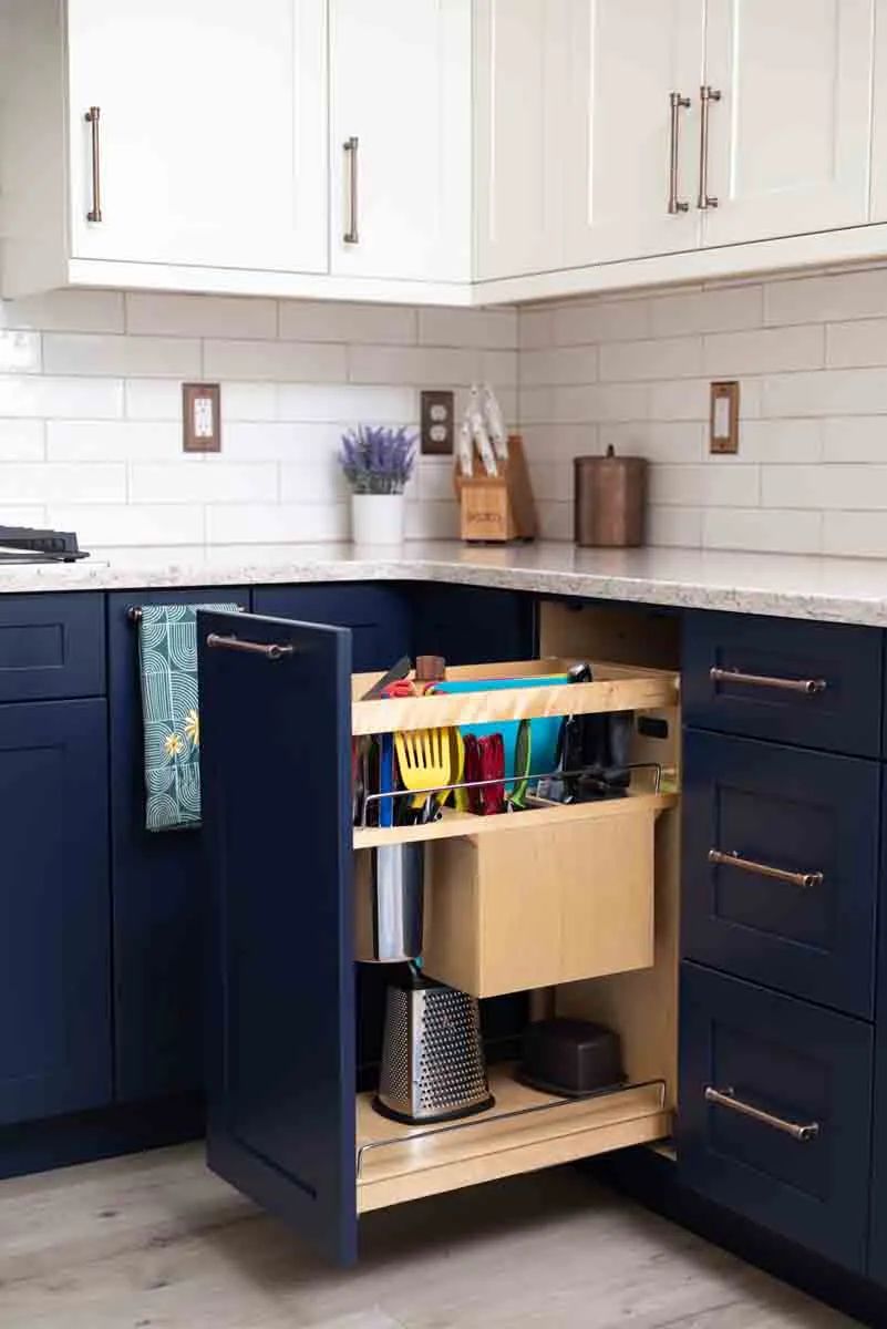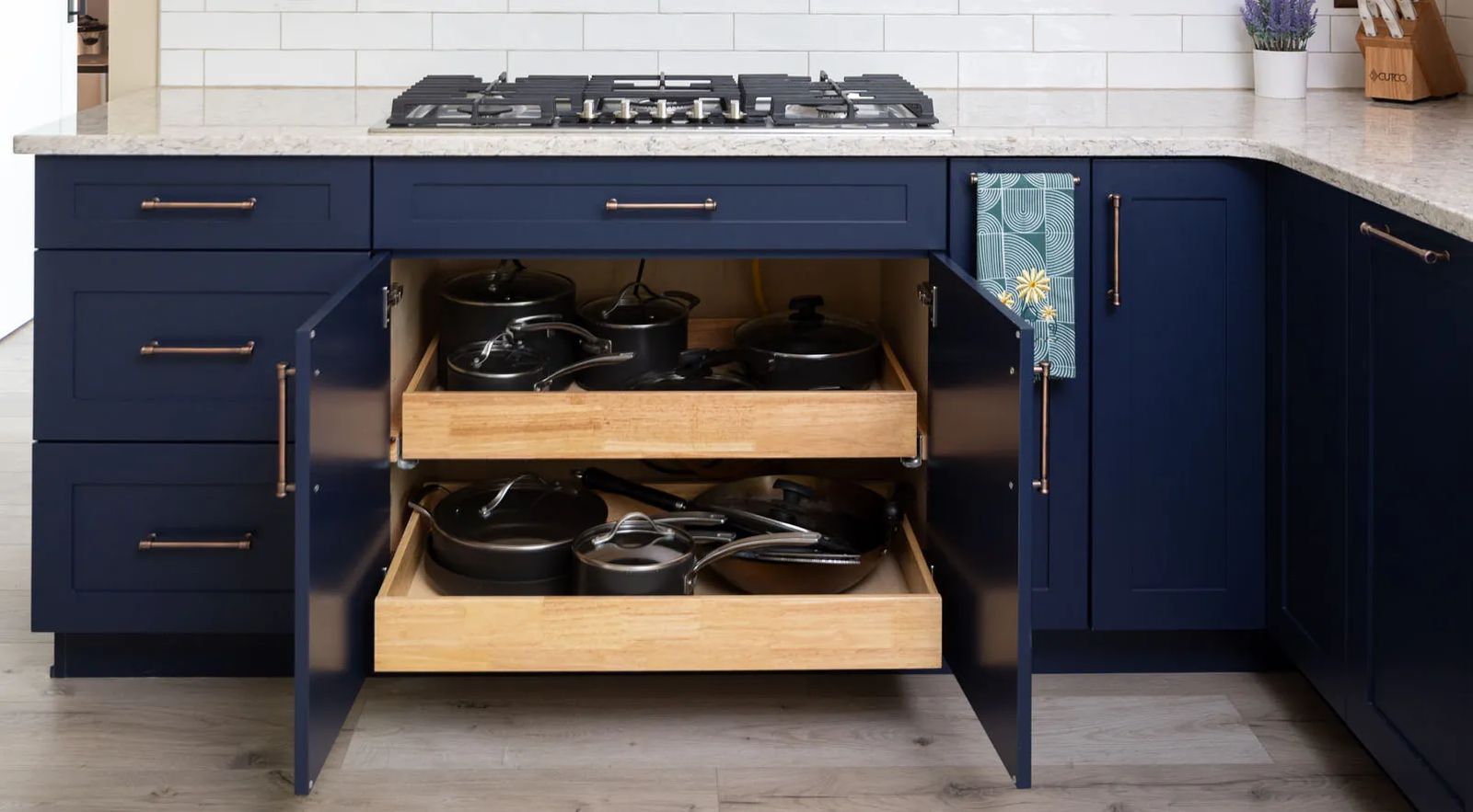1. Pull Out Drawers: Cut down on drawer chaos and clutter with the help of a roll out tray. Think of a rack for your pots and pans, lids or even a slide out spice rack.