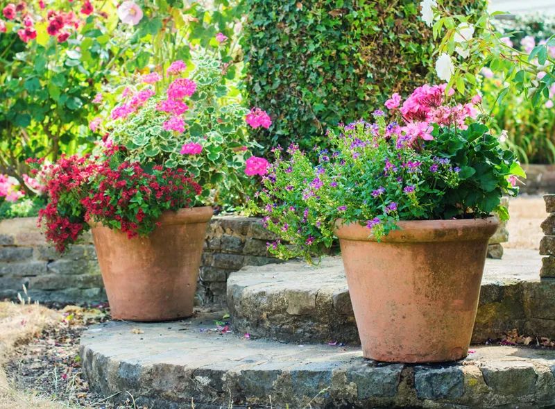 For a patio pot to flourish, it needs to be big enough to hold enough soil and water to allow plants to put down a good root system. The best pots are almost as wide as they are deep and should be about 14-16 inches in diameter. For extra-large or tall pots, Mick Gainan of Gainan’s Garden Center suggests using a smaller liner for the plantings and filling the empty space. If you’re in a windy spot, rocks work wonderfully. If wind isn’t an issue, try chunks of Styrofoam.