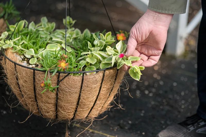 Hanging baskets with coconut fiber liners dry out quickly, so you’ll want to line them with plastic and poke a few holes in the bottom for drainage. Then, fill them with soil and trim the plastic.
