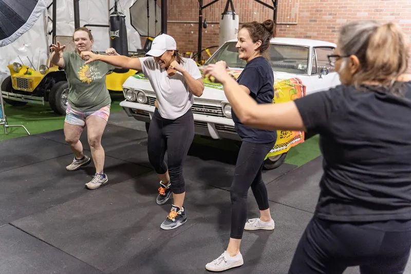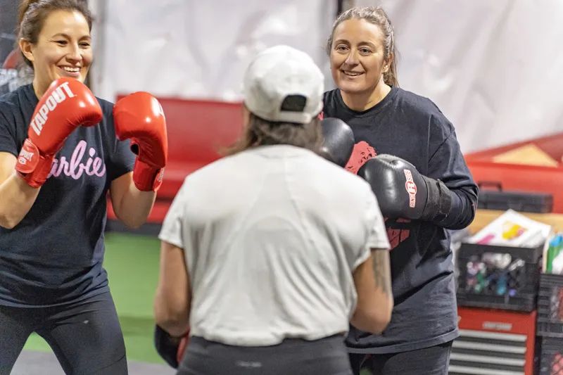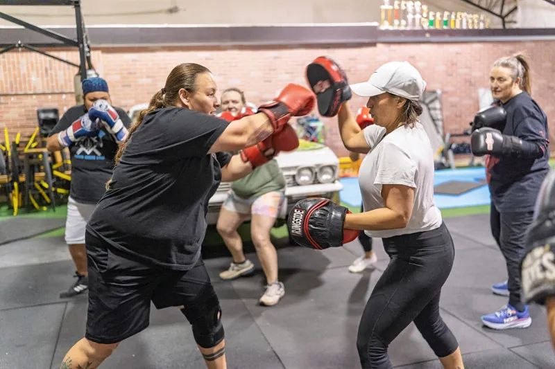 “The neurons are firing right now,” Wamnee shouts with a laugh as she urges her ladies to keep those one-two punches coming. She shares how bilateral movements calm the nervous system, helping to take these women out of a fight-or-flight response.