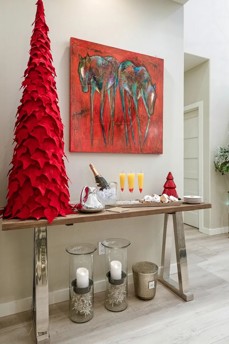 Step a few feet inside and you’ll find a side table prepped and ready for guests. The bright and bold poinsettia tree stands tall over a continental style breakfast with spiced mimosas and cinnamon rolls.