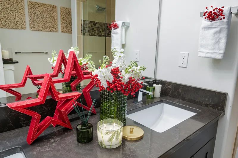 As you bring out all your decorations, don’t forget to add a little holiday pizazz here and there. Think faux berries tucked in with real flowers, elements of color added to a bathroom vanity and, of course, the smell of evergreen in the air.