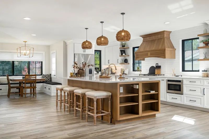 “We are seeing a strong return to stained wood cabinetry and accents,” Angie says. Oak, walnut and maple are being paired with creamy, warm-based whites to keep kitchens and baths feeling bright and welcoming.