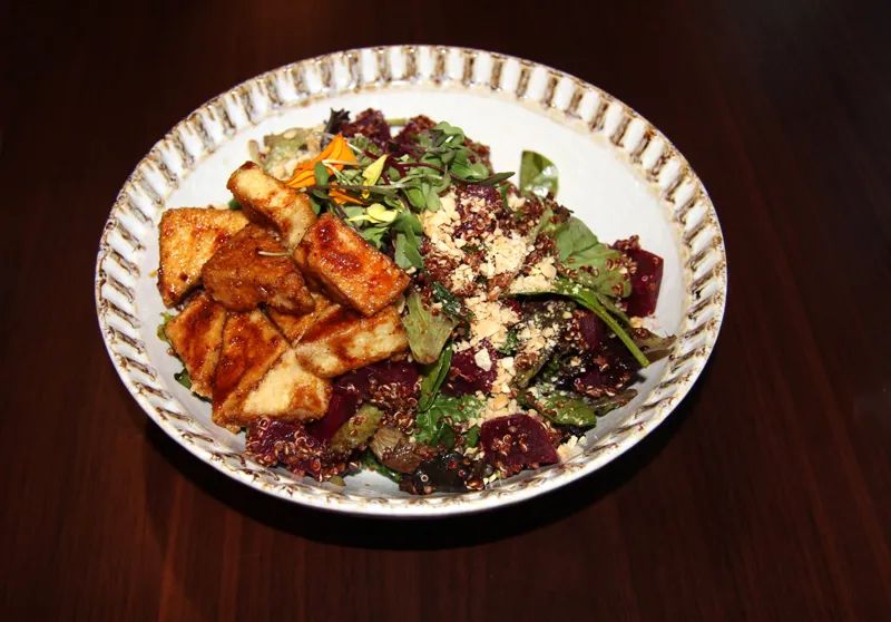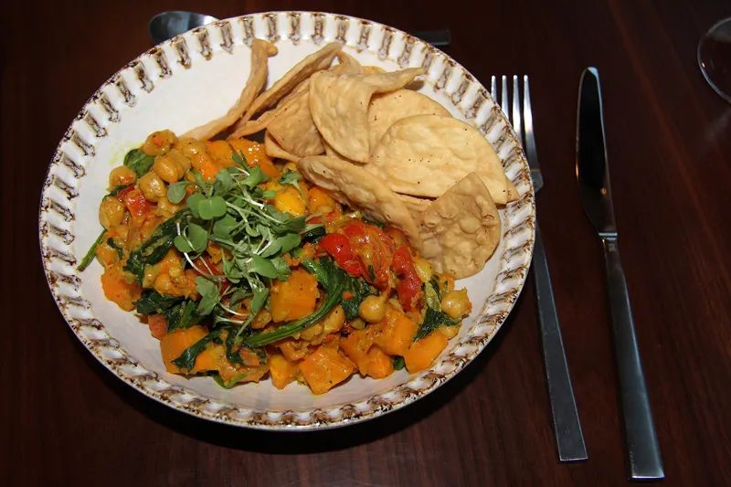 Brent and Executive Sous Chef Lloyd Huff deliver to our table the Quinoa Protein Bowl that Val orders and the Curried Squash Bowl that I select. Both are fresh and flavorful and beyond generous in portion size.