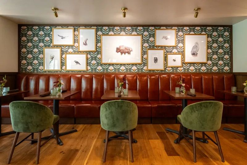 After receiving our key cards, Val and I make our way upstairs, pausing at the old phone booth that once held a coin-operated phone. It is now lined with dark-blue wallpaper featuring ethereal nature scenes, anchored by a leather chair and a side table, where a guest can converse privately. Next to the booth is the Wildwood sitting room, themed in red, where a group can gather before heading into the dining room.