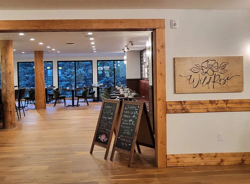 When we arrive, Tyler Pyle who mans the front desk, greets us with a warm welcome, standing at the front counter paneled with belts. The Wild Rose Restaurant sits off to one side, overlooking the creek, across from a small area selling merchandise. Tyler has been working here since July, after following General Manager Troy Douthit from Libby, where Tyler worked at both the Venture and Country Inns.