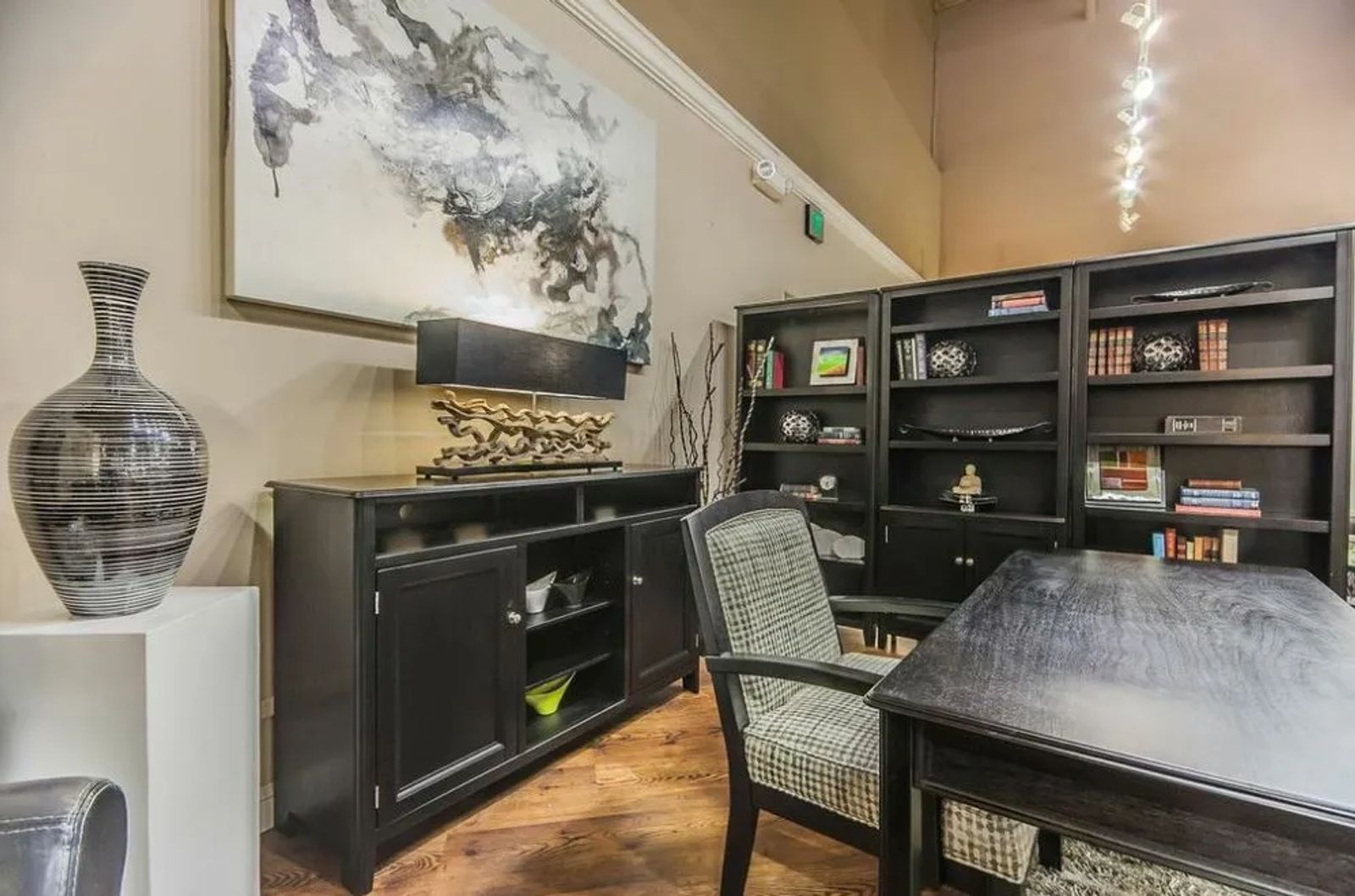 When designing that work space, why not wrap your home office around what speaks to you. “It’s whatever makes you feel comfortable,” advises Victoria Seitz, designer for Ashley Home Furnishings. She created this bold, yet, soothing room dressed in basic colors and inspired by a monochromatic and free-form art piece. The art presents a “contemporary splash” while a unique driftwood lamp beneath it mirrors the art’s flowing movement.